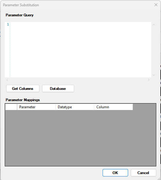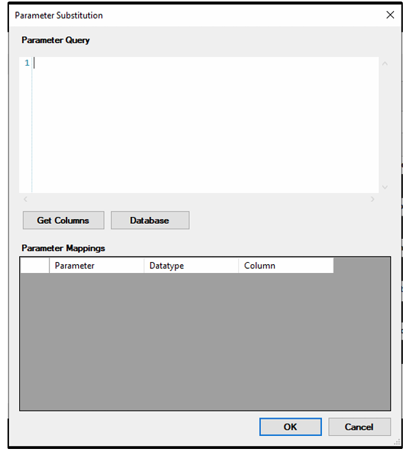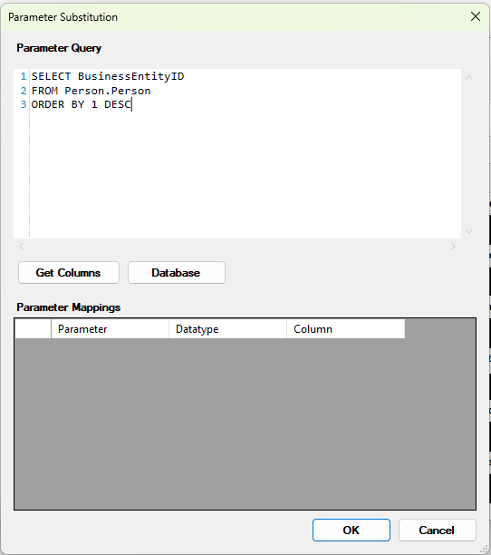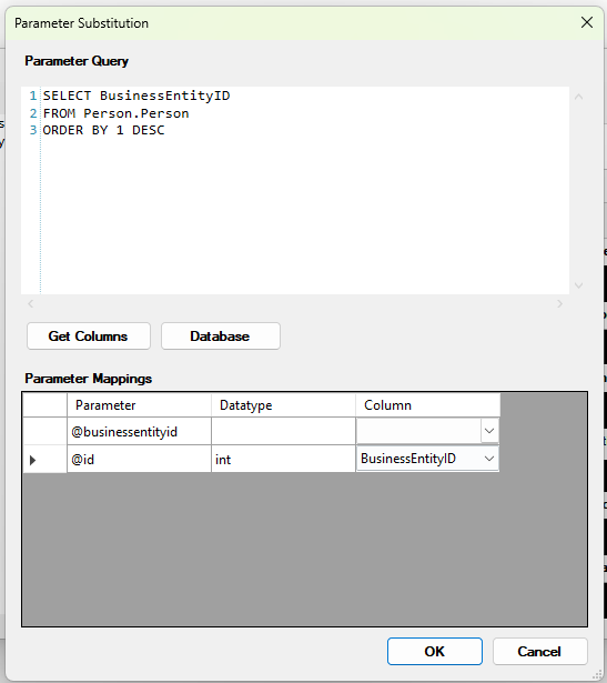 - Se pulsa «Get Columns» para que el programa recoja los parámetros de la consulta original y así poder asignar el parámetro con el valor correspondiente de esta consulta.